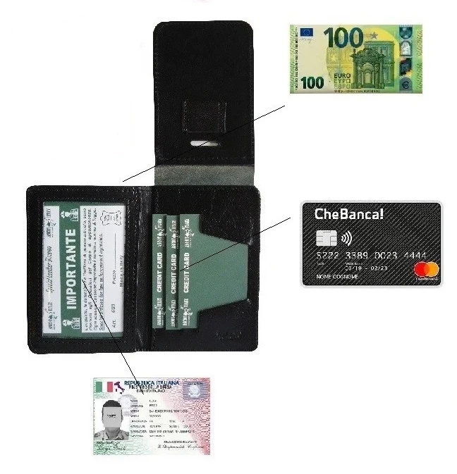 Interno: una parte trasparente porta tesserino, una tasca portasoldi, tre posti carata di credito.