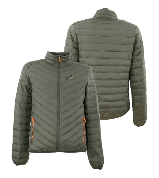 Tessuto nylon idrorepellenteImbottitura sinteticaPolsi e fondo in lycraTasche con zipRiponibile in tasca internaInterno in arancio
